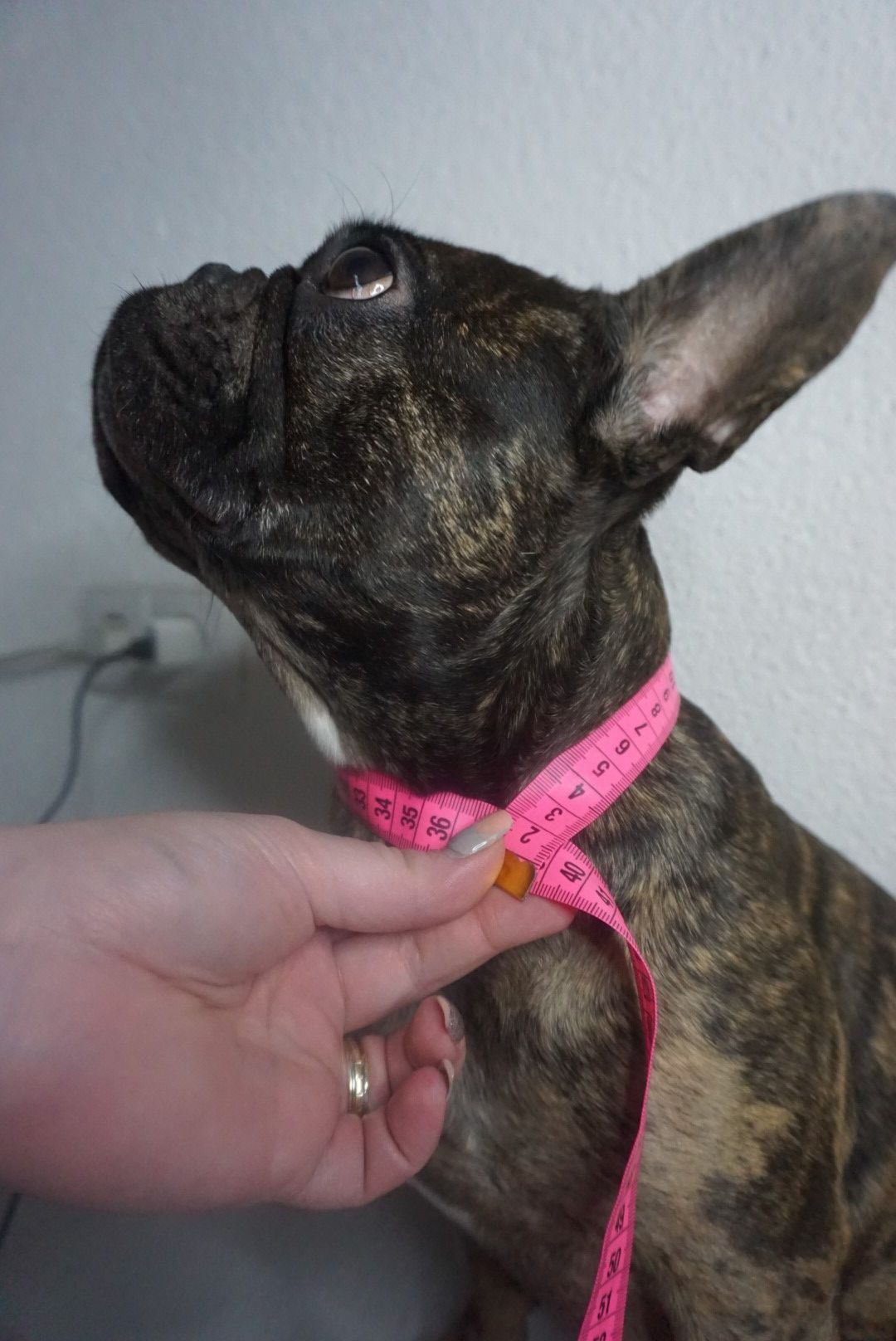Nimm ein flexibles Maßband, was du in der Mitte des Halses anlegst. Bitte miss eng und ohne Puffer. Damit das Halsband gut sitzt und nicht zu groß oder zu klein ist, musst du sehr genau Messen.